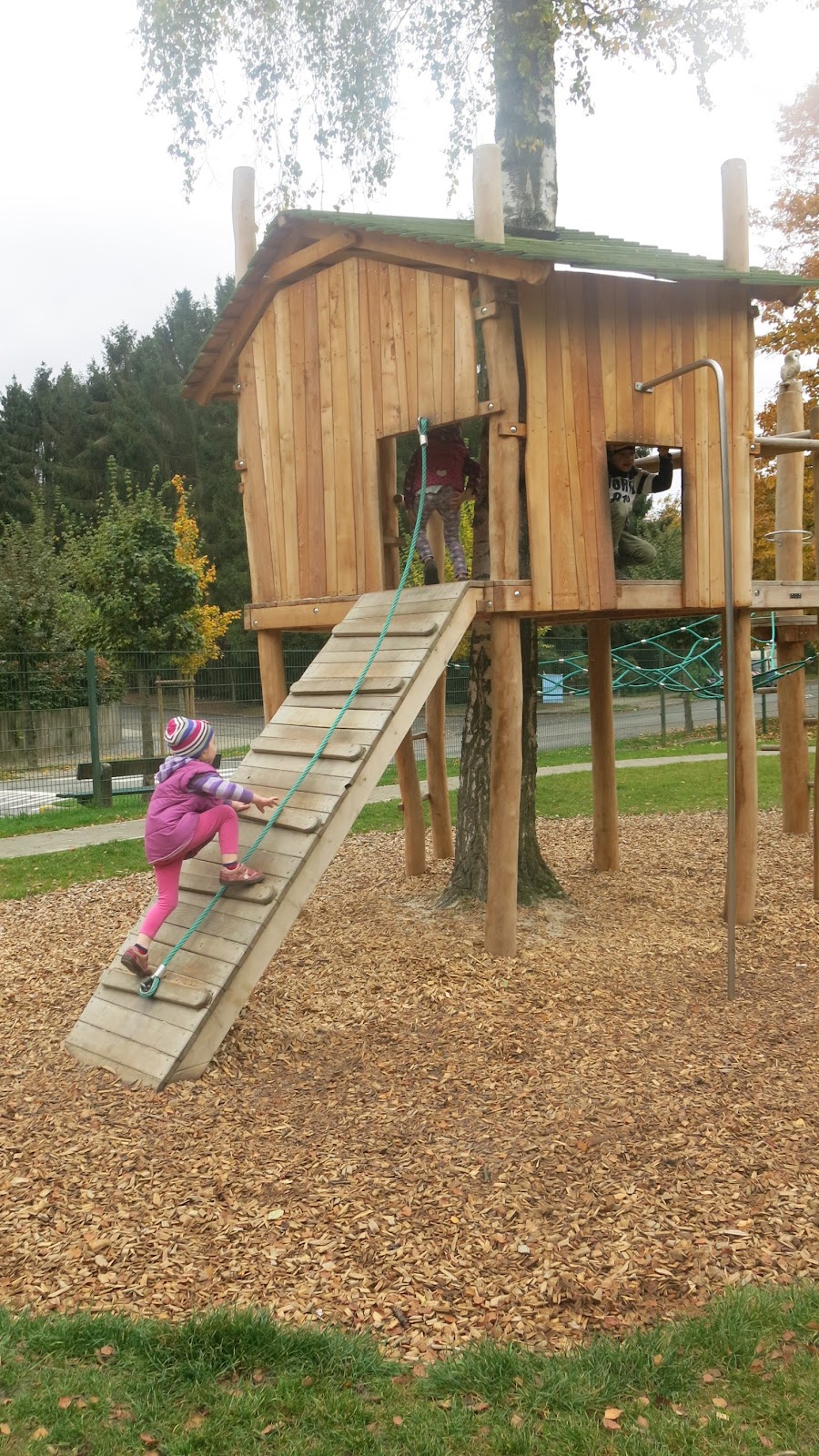 It is a multi-functional area, with the big old cloister building with its open spaces, two playgrounds (one entirely in the form of a pirate ship) and a little forest-gym / obstacle course part connecting the two. There is lake to walk around, some horses and donkeys to see and a big sport fields nearby.